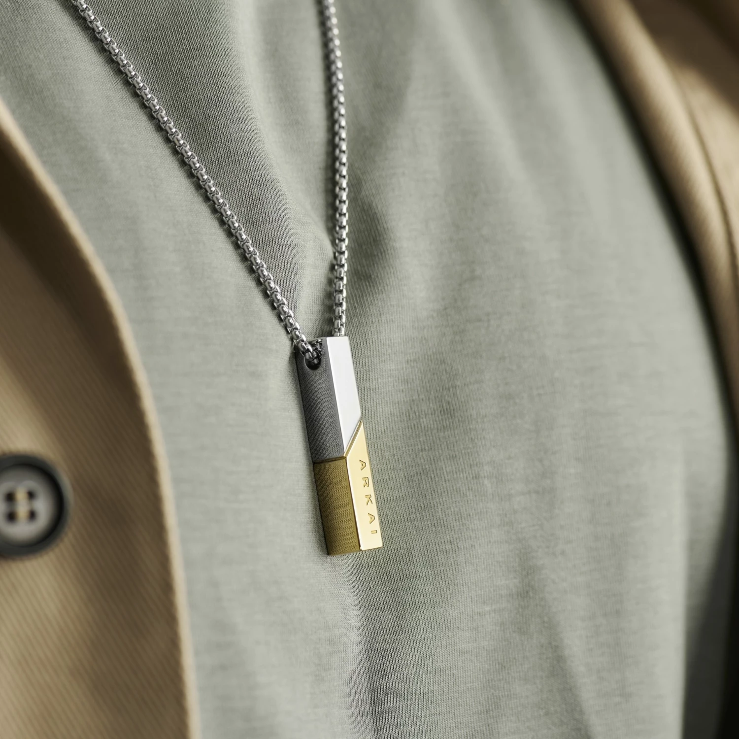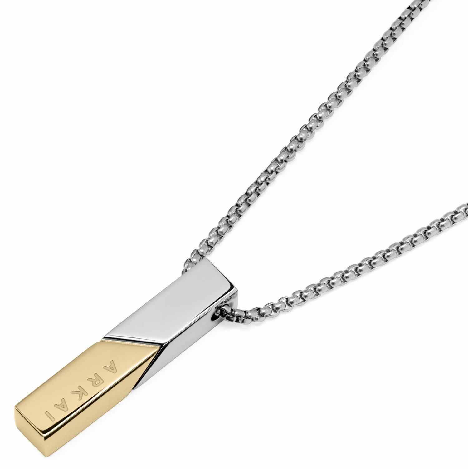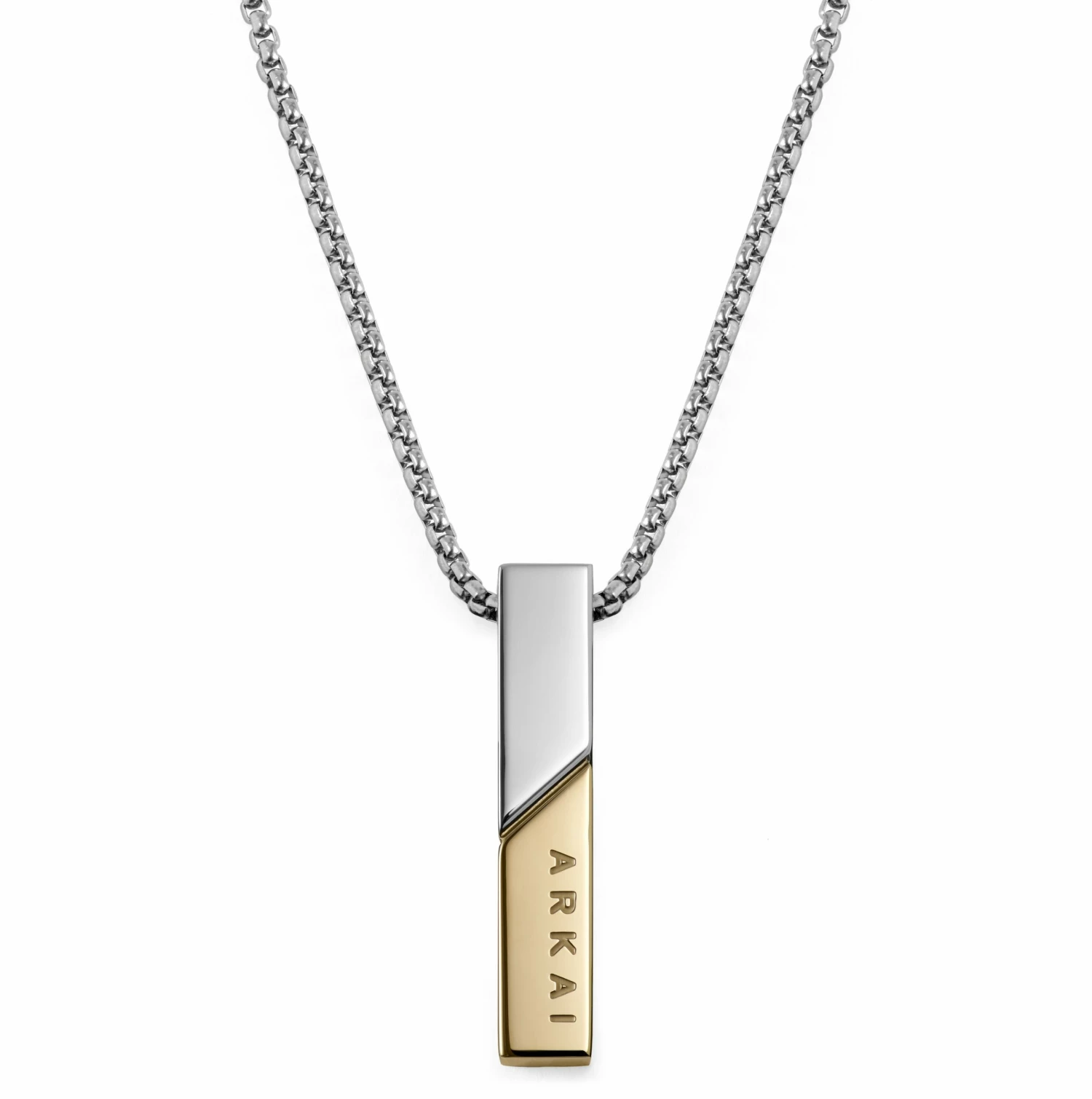 The weighty pendant on this men’s necklace is made of surgical-grade stainless steel and features ‘ARKAI’ prominently written down its side. That’s how proud we are of its simple, rugged design.