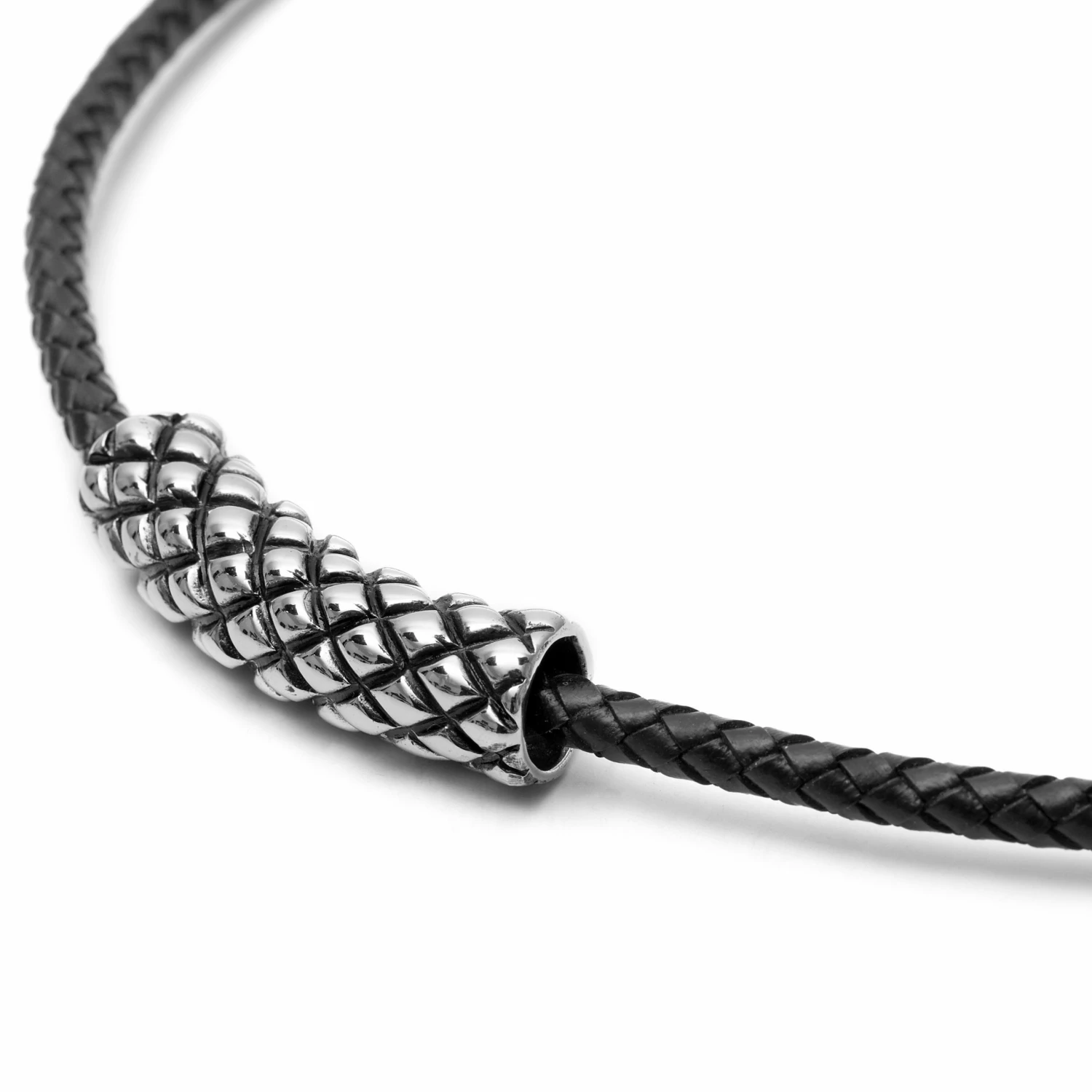 Stainless steel and leather have always complemented each other admirably. This men’s necklace, with a crisscrossing pendant, stick with what works instead of trying to cross trends.