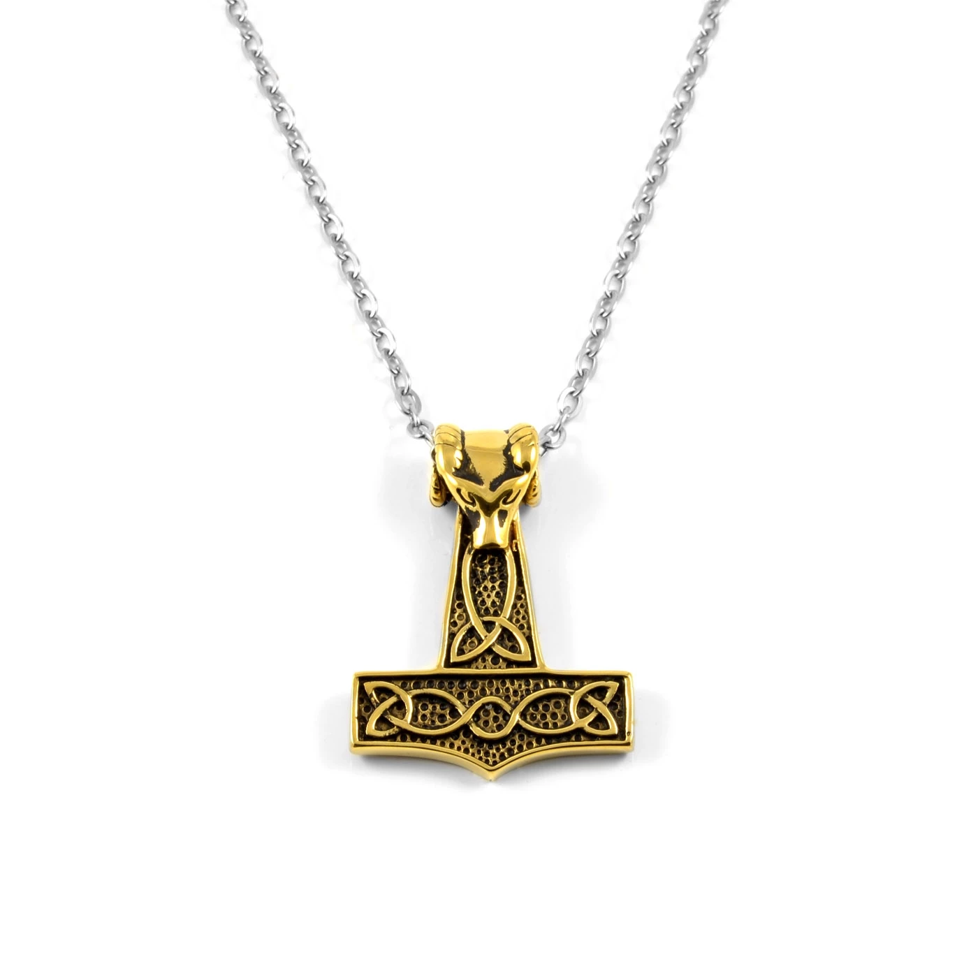 Channel your inner God of Thunder with this awesome men’s necklace. Inspired by Norse mythology, this piece features a detailed Thor’s hammer design, mounted by the classic goat’s head and in beautiful gold and black tones.