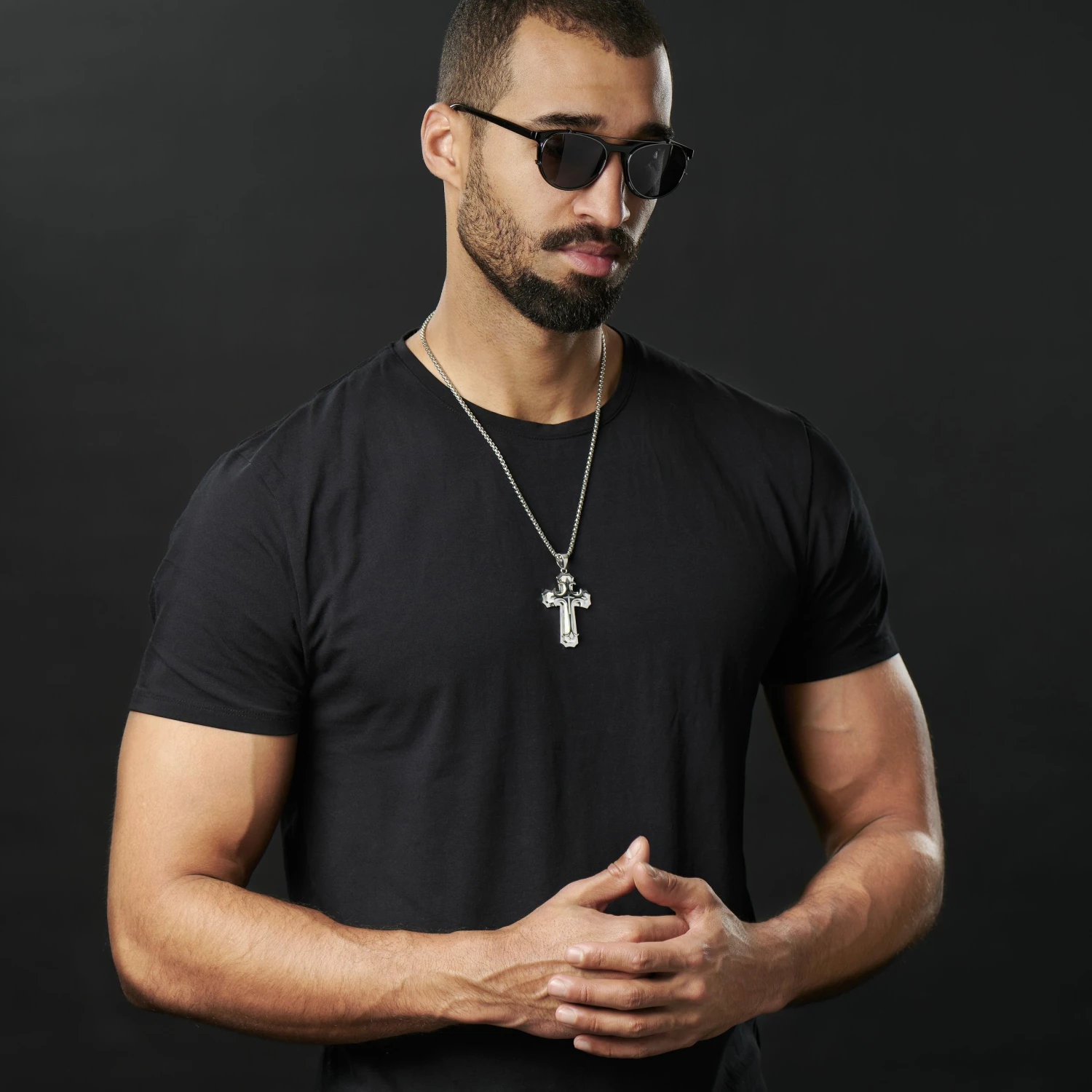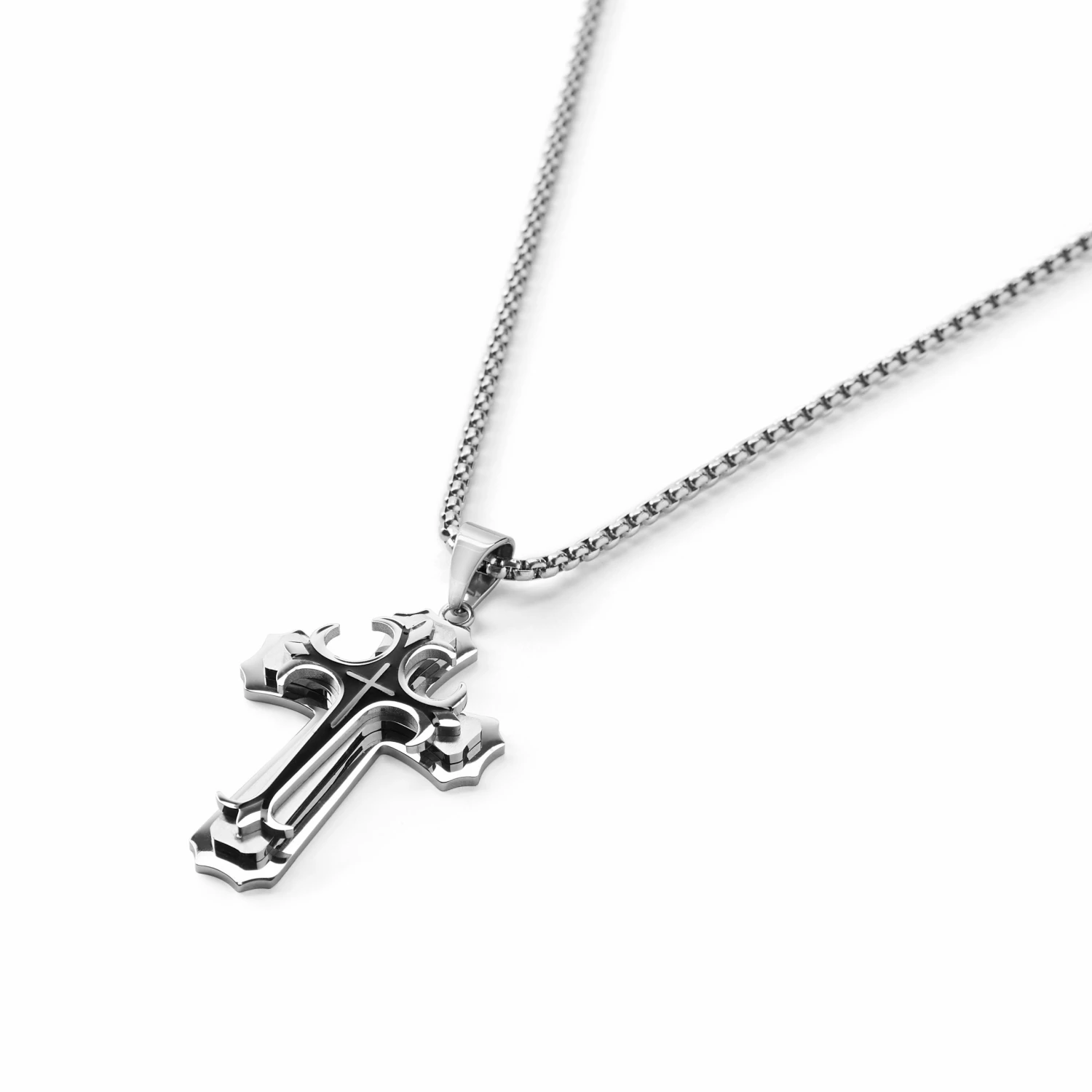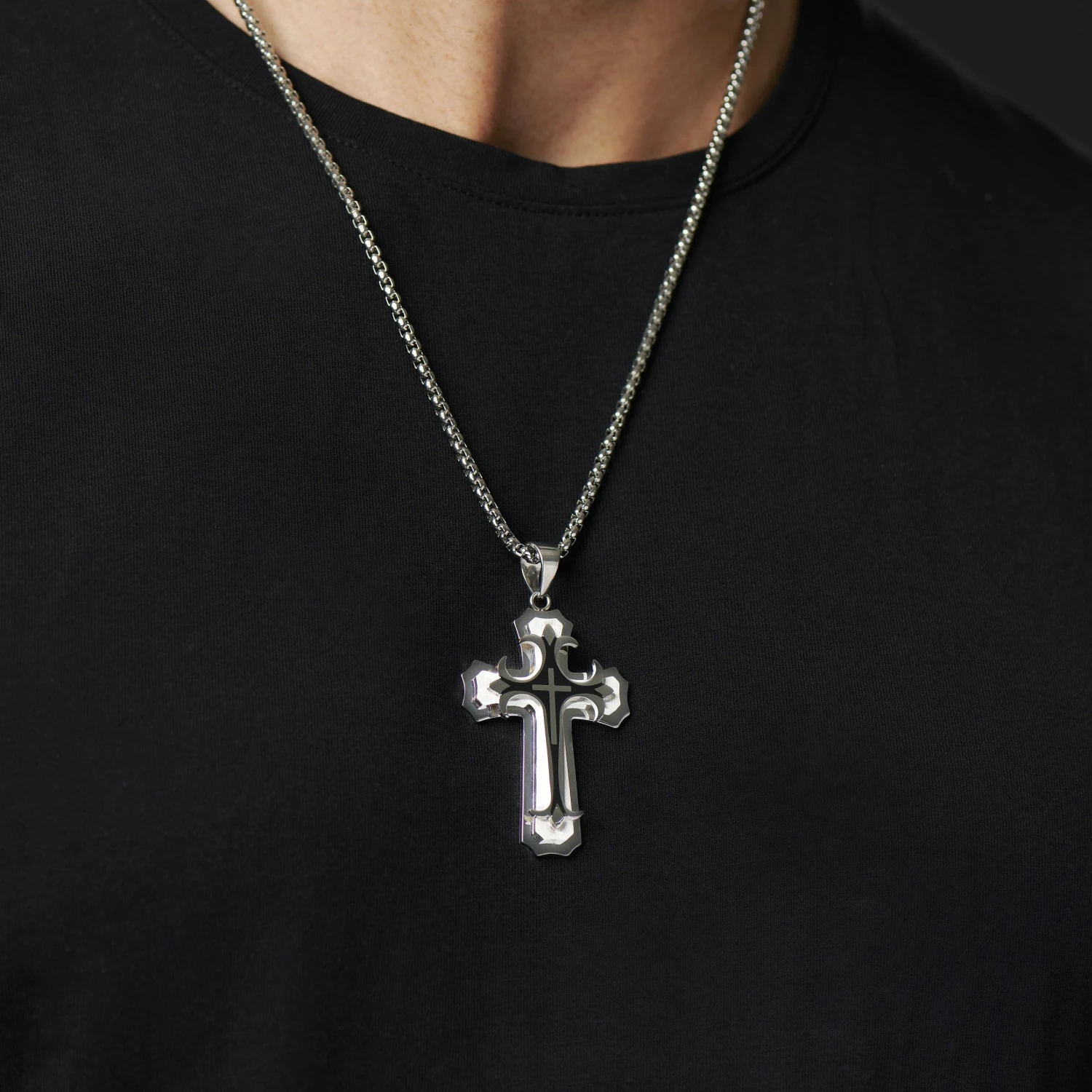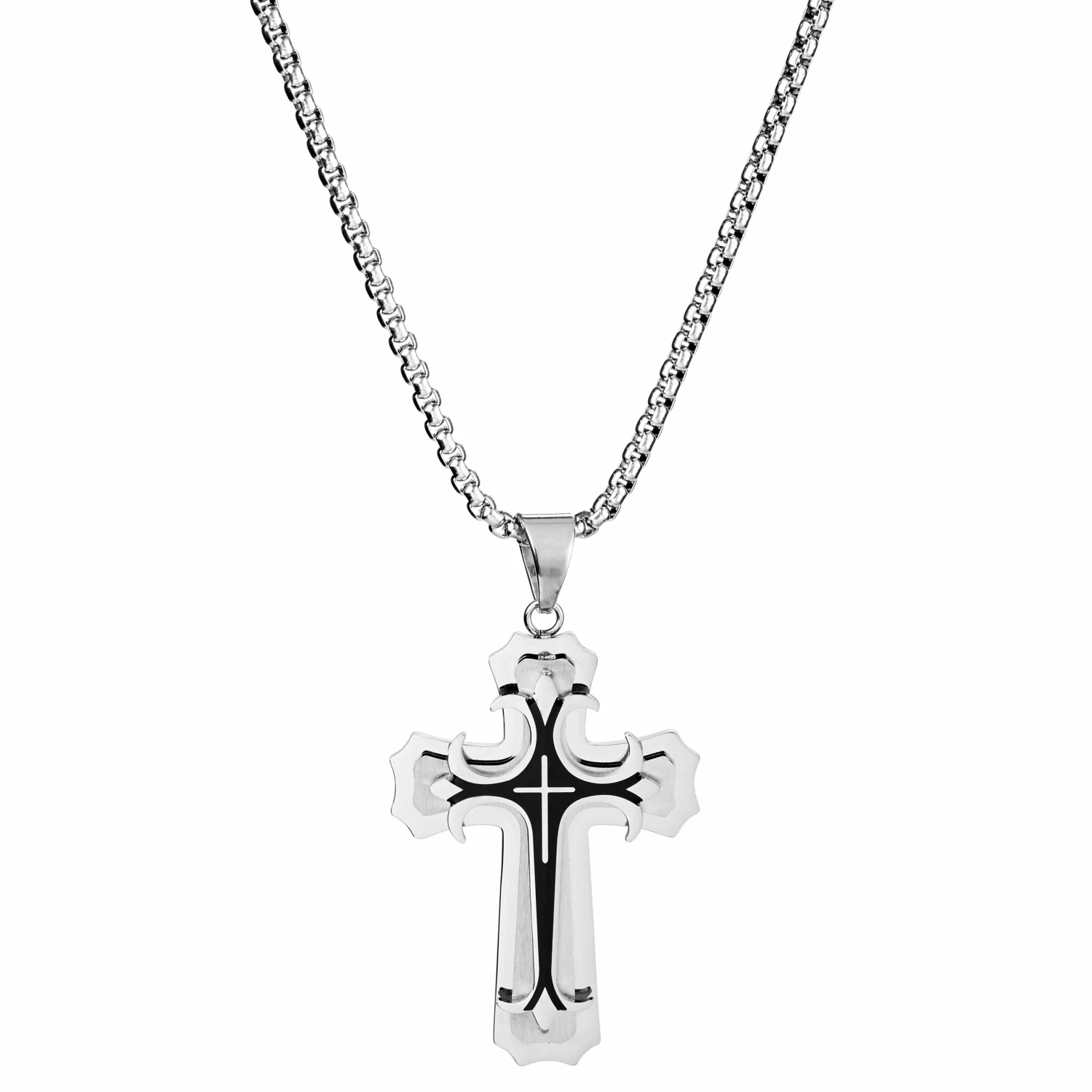 This St. Thomas cross (also known as a Persian cross) pendant for men features 3 levels of sturdy stainless steel that have been carefully arranged for a three-dimensional effect. Two different finishes on the steel showcase the black center detail and provide a striking contrast when the light catches.