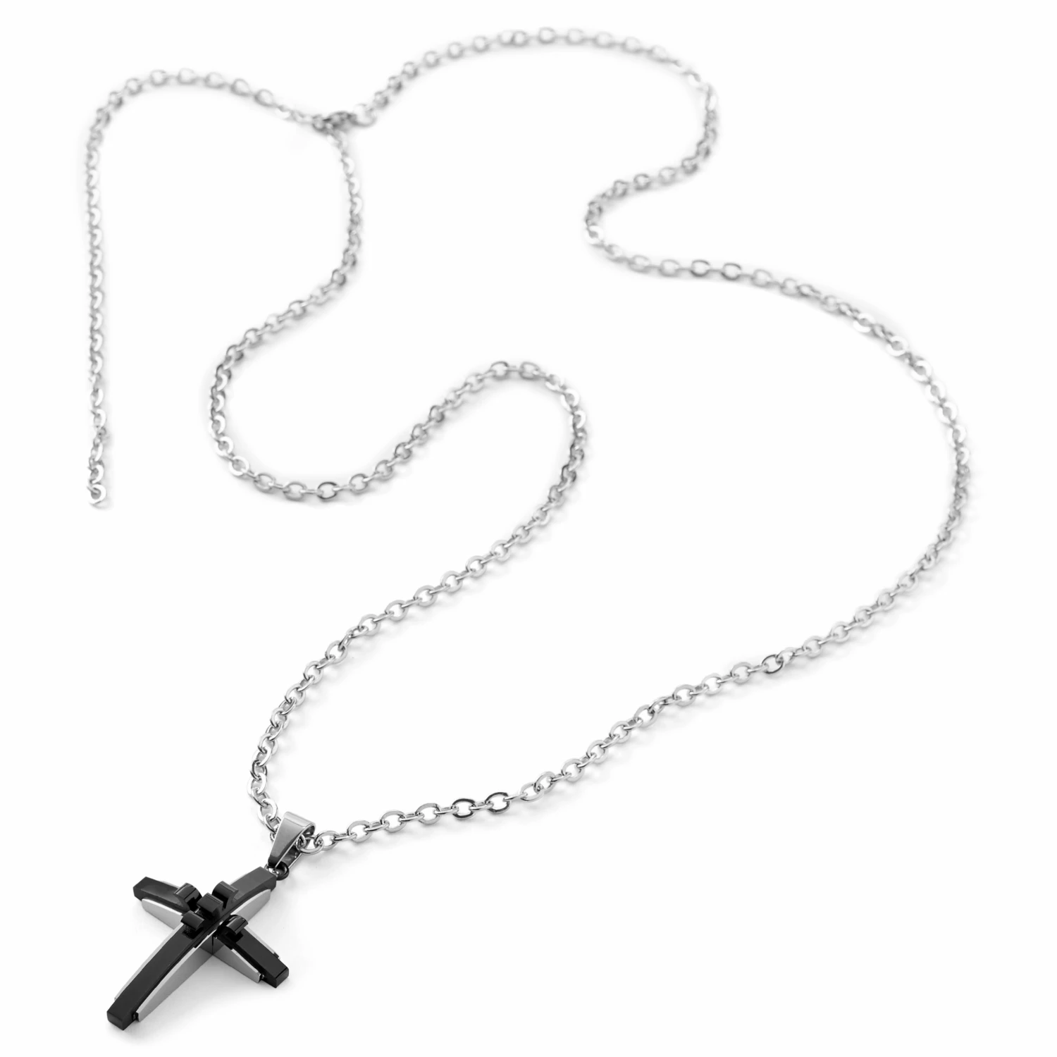 Add a touch of urban style to your outfit with this necklace for him. The black center pieces are hooked on the ends and meet in the middle of the cross for an effect that is both edgy and eye-catching. Polished steel creates the frame of the pendant and gives it weight and feel.