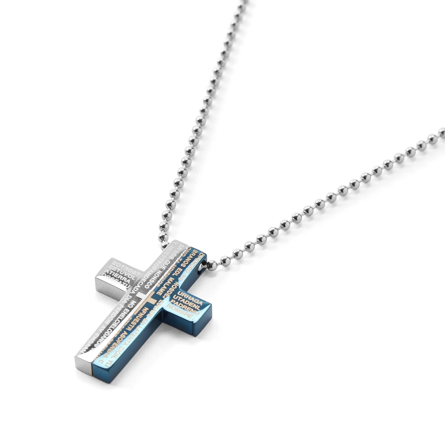 This 2-piece cross necklace features a reversible design with letters on one side and a brushed steel finish on the other. A small cross forms in the center when the two halves join together. The blue and silver color scheme add a masculine touch to this contemporary accessory.