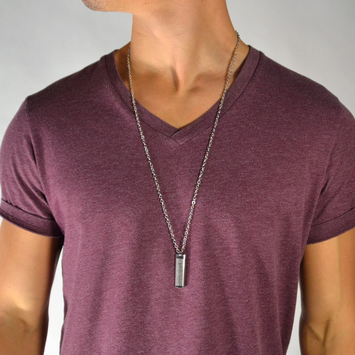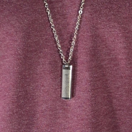 This elegant ingot-shaped pendant features laser engraved letters as well as a tiny cross. Hangs gracefully from an adjustable chain. A true conversation-starter!