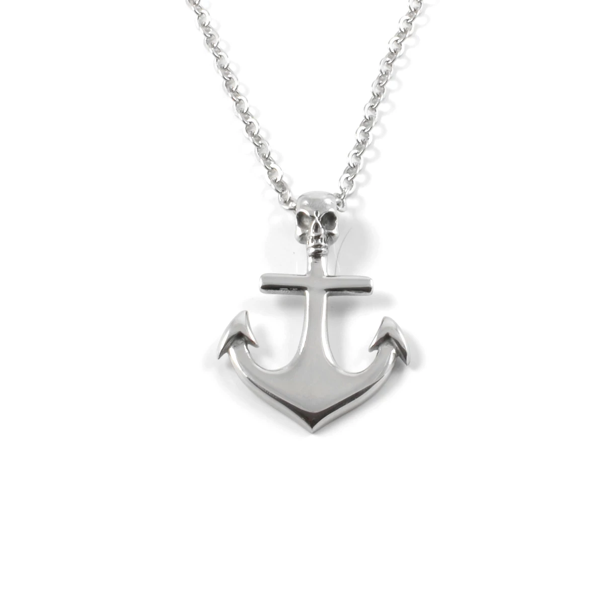 Anchors away me hearties! This nautical pendant features a large anchor topped with an intimidating skull. Crafted entirely from steel. Hangs forebodingly from an adjustable chain.