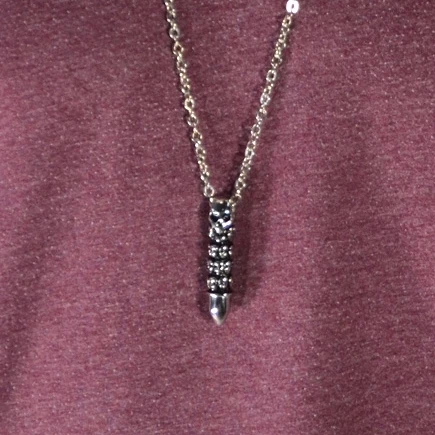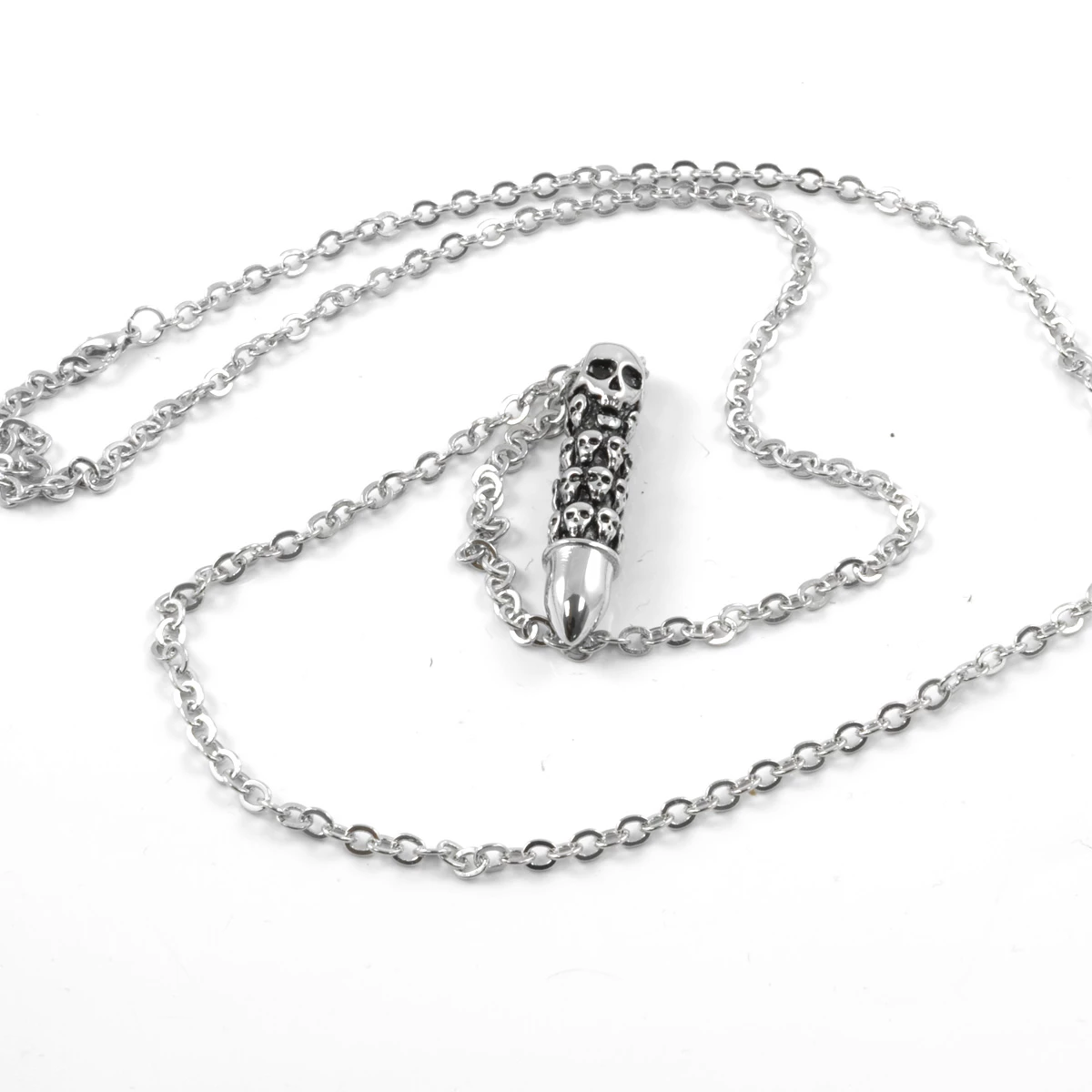 A haunting pile of skulls is etched onto the surface of a bullet. Unique and dramatic! Hangs forebodingly from an adjustable chain.