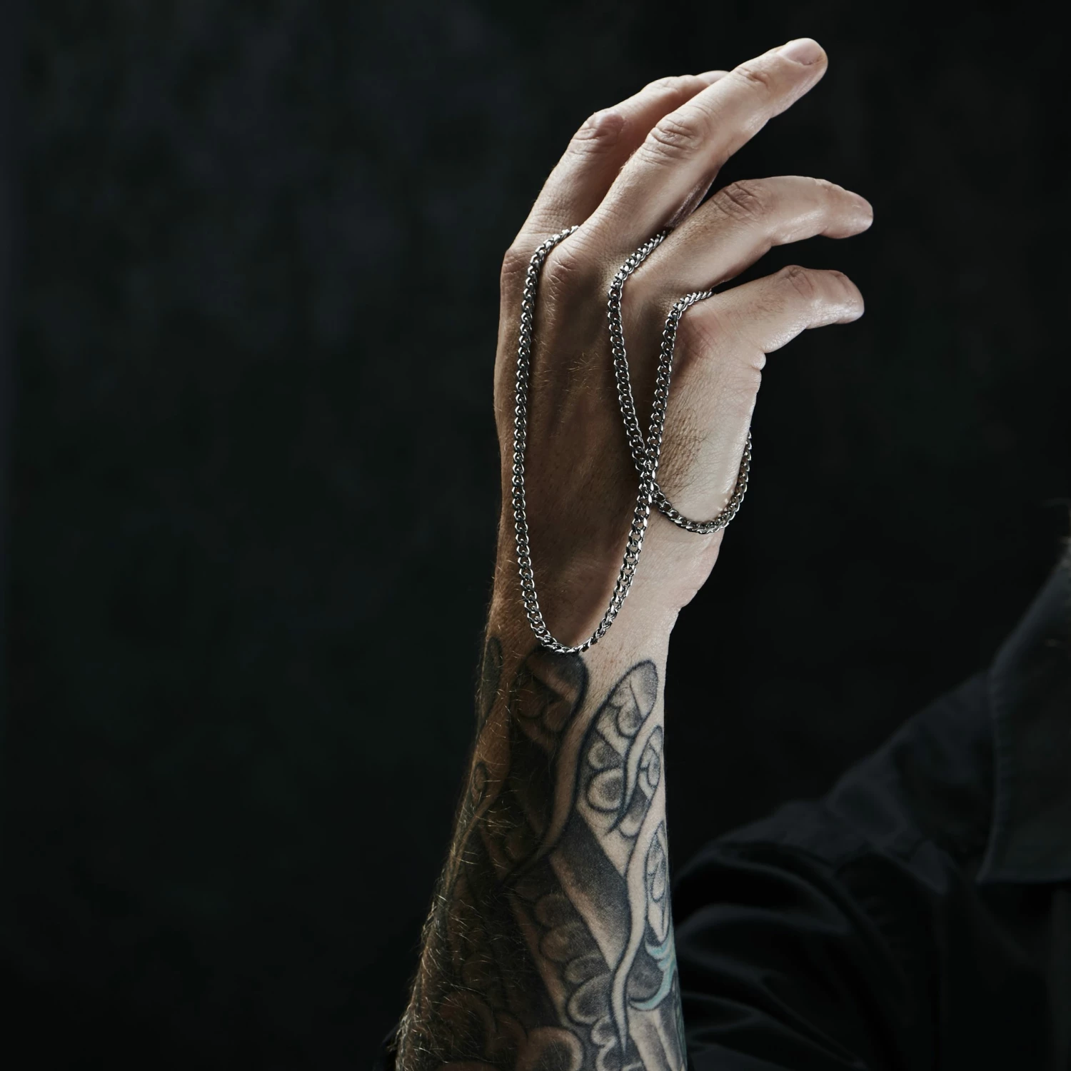 This sleek men’s necklace features a classic 1/5″ (4 mm) wide chain in an elegant silver tone. Finished with a simple coordinating lobster claw clasp.