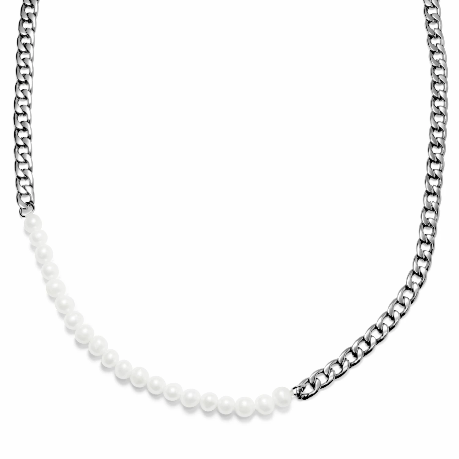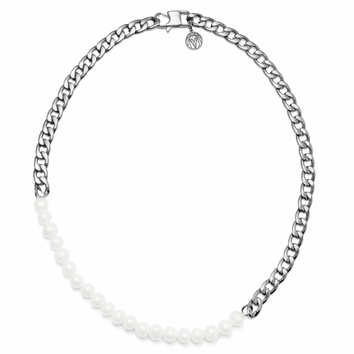 Itβs fashioned from hard, tarnish-resistant stainless steel links and creamy white pearls. Closes securely around your neck with a lobster clasp.