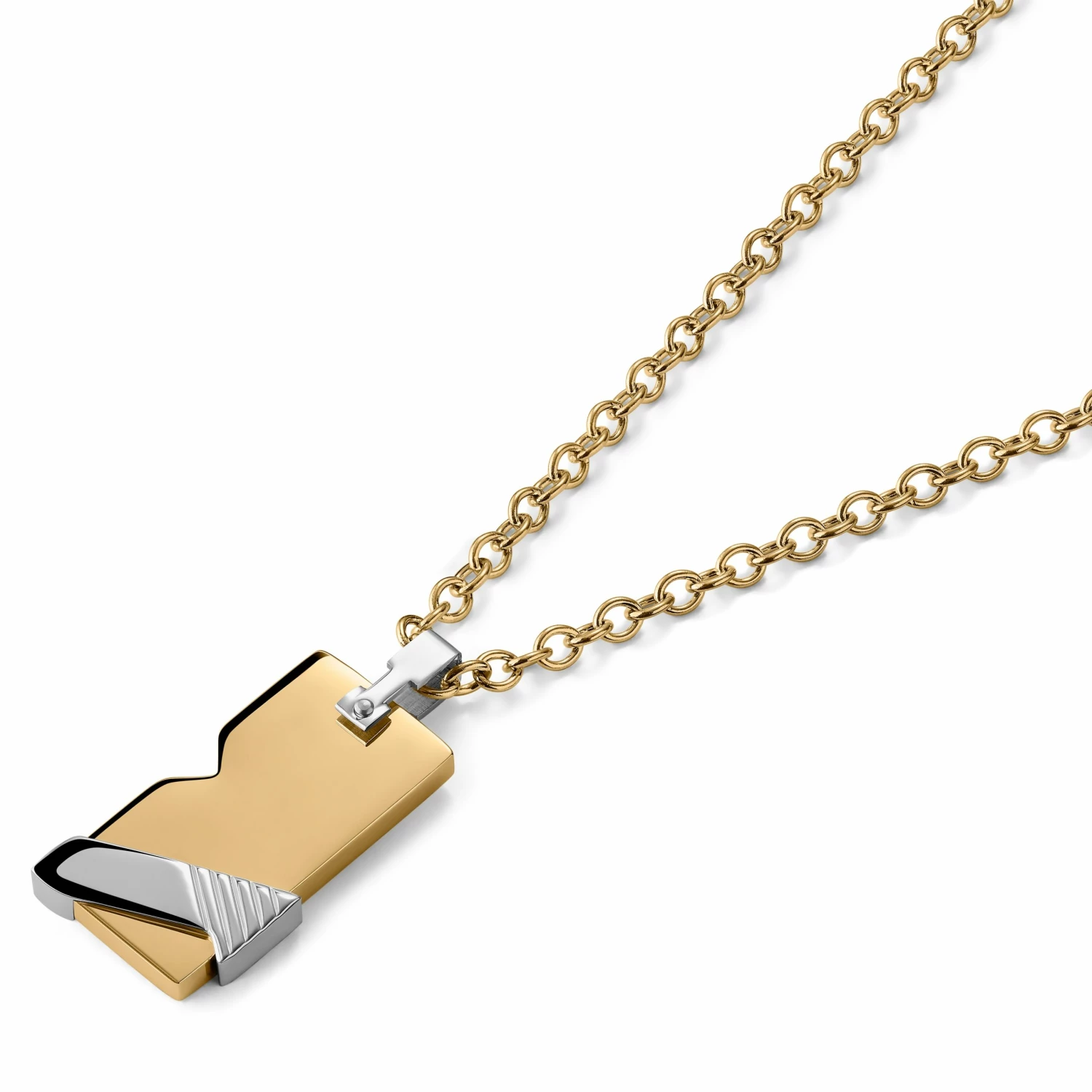 A modern take on the classic dog tag. Gold-tone, surgical-grade stainless steel, polished to a shine.