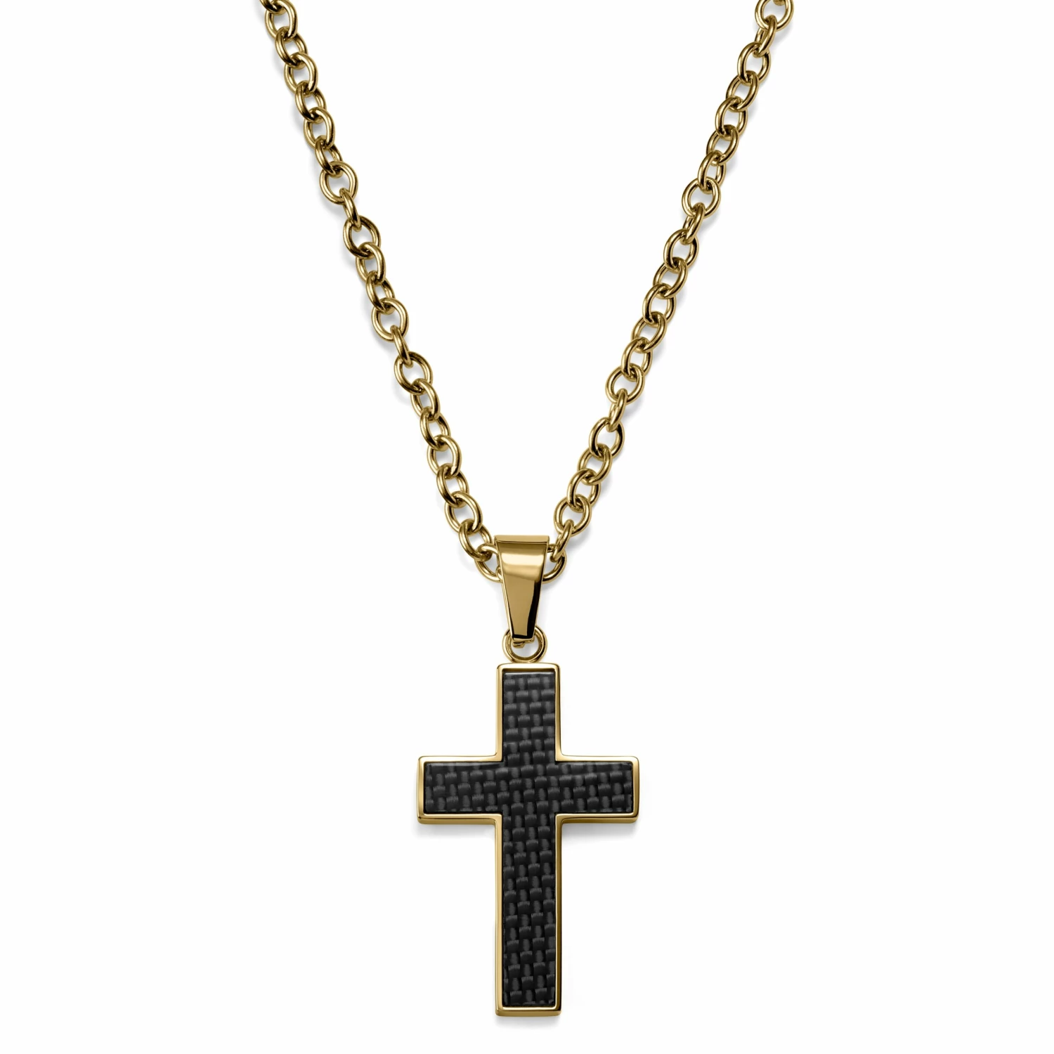 This men’s necklace boasts a solid cross pendant with black carbon fiber inlay. With surgical-grade, gold-tone stainless steel surrounding it, itβs designed for the faithful and the fashionable.