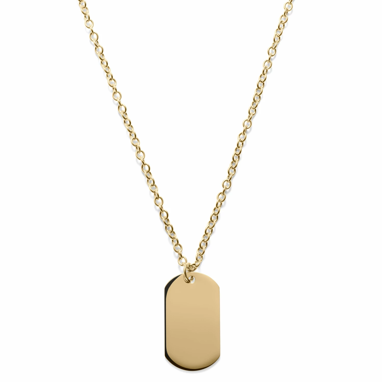 This classic design features a single dog tag made from rust-resistant, surgical-grade, gold-tone stainless steel and polished to shine.