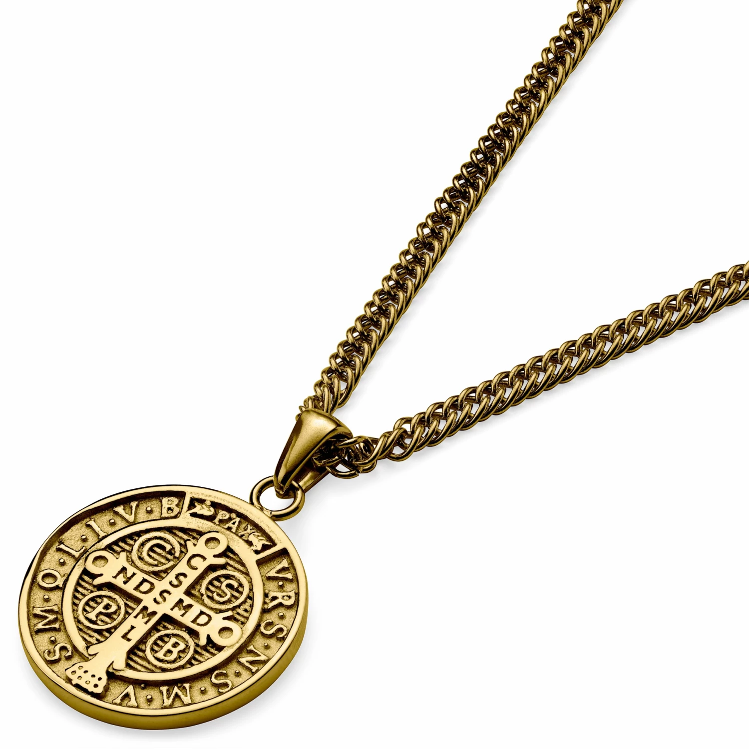On the reverse, the back of the iconic St. Benedict medal is displayed. The letters C S S M L – N D S M D signify “may the holy cross be my light – may the dragon never be my overlord.” The encircled C S P B means “The Cross of Holy Father Benedict.” Surrounding these are the letters V R S N S M V – S M Q L I V B, which means “Begone Satan. Never tempt me with your vanities. What you offer me is evil. Drink the poison yourself!” At the top, the word ‘PAX’ means “peace.”