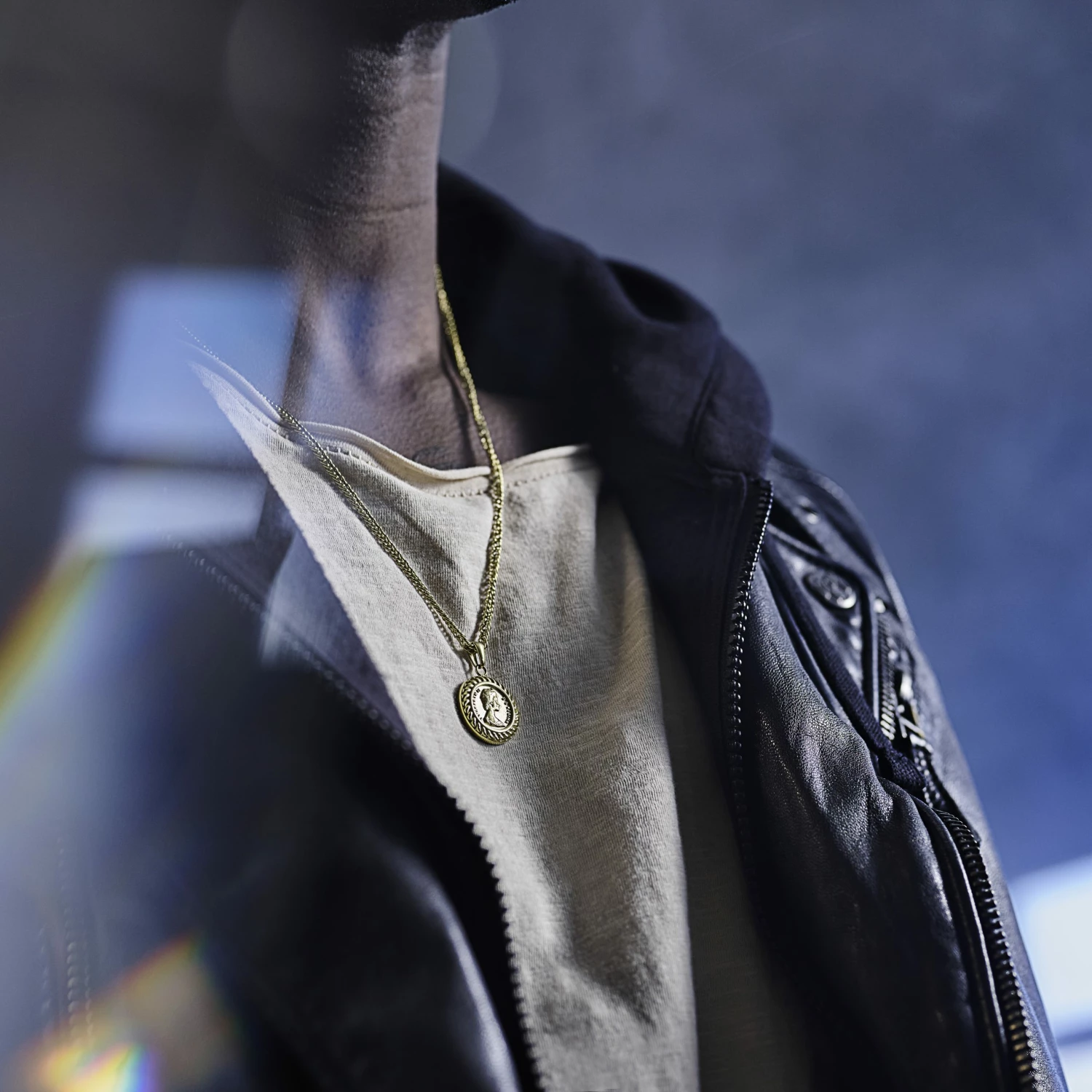 This gold-tone men’s pendant features Queen Elizabeth II and the inscription ‘D.G. Regina’, which translates to ‘By the Grace of God, Queen’.