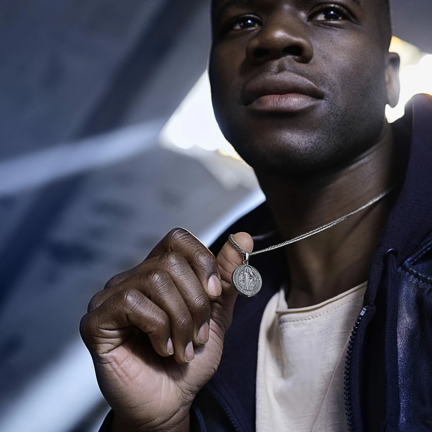 This silver-tone steel pendant is named after the iconic Saint Benedict medal.