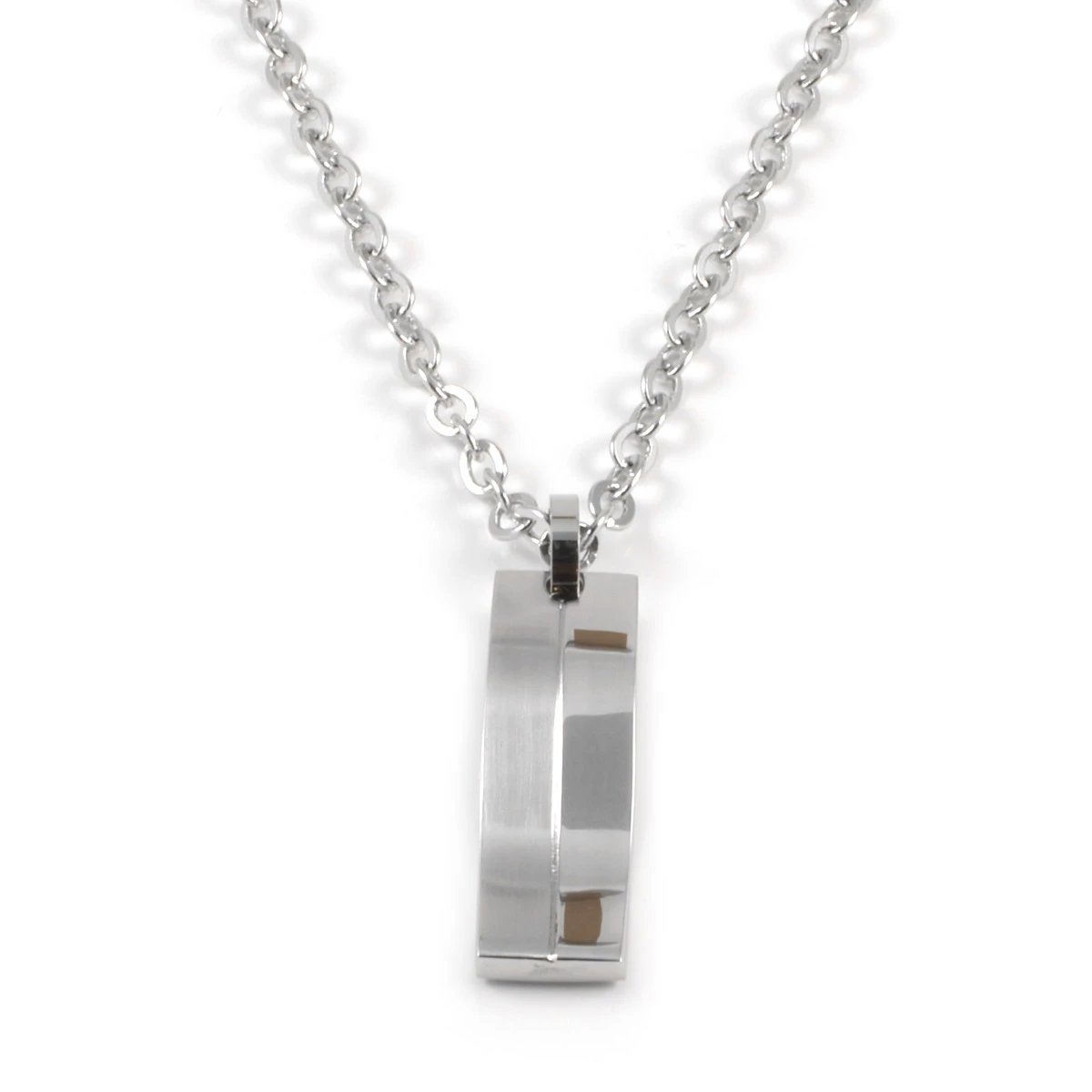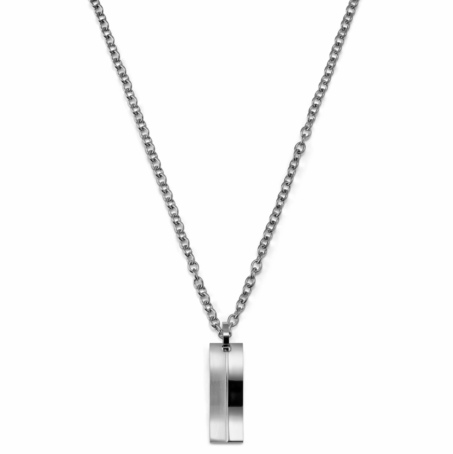 This unique stainless steel necklace for men features an unusual curved pendant. Sleek and modern!