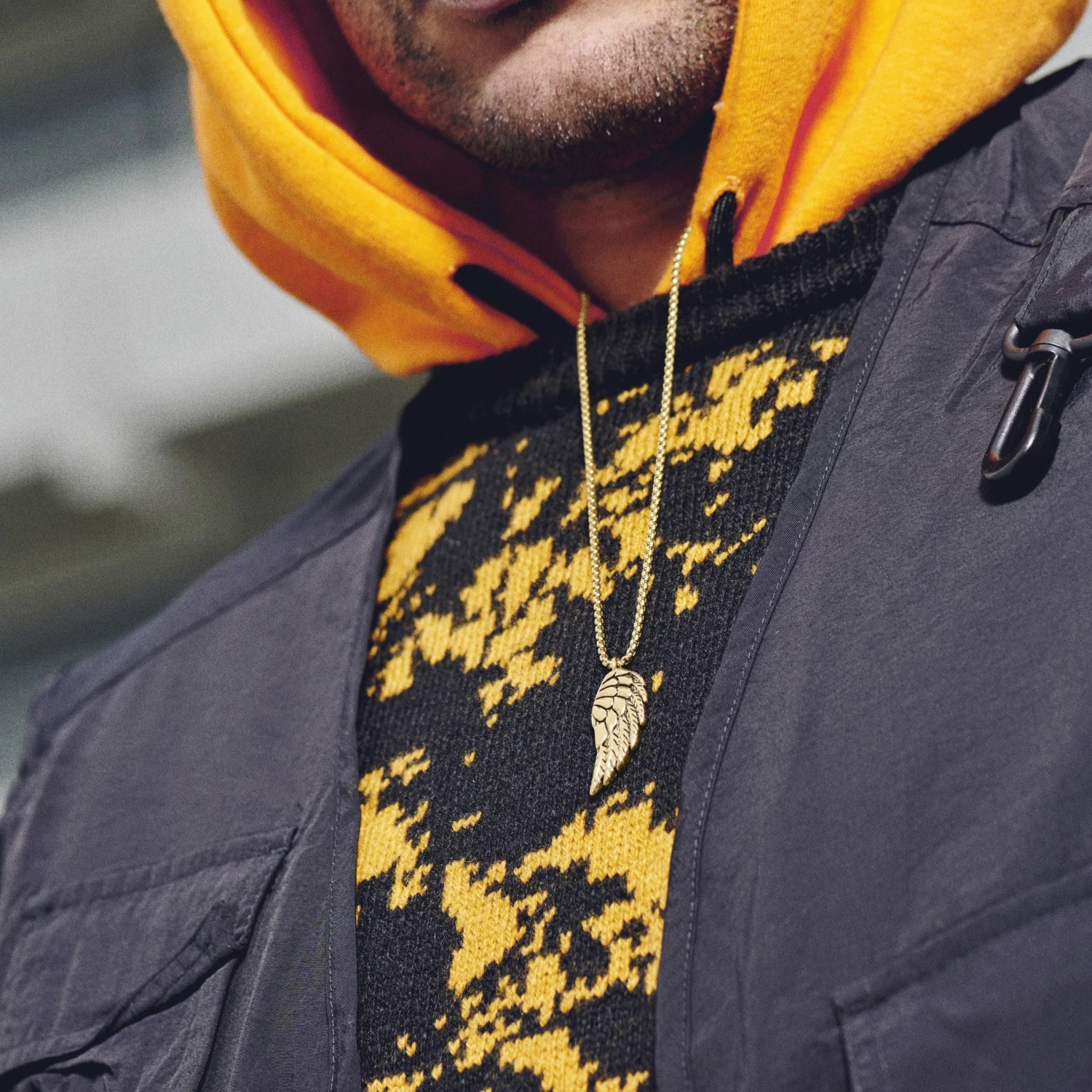 This men’s necklace is made of scratch- and tarnish-resistant surgical-grade stainless steel PVD coated gold tone. The curved box links provide superior comfort, and the chain’s adjustable length puts you in charge of where the wing falls. Closes securely with a lobster-claw clasp.