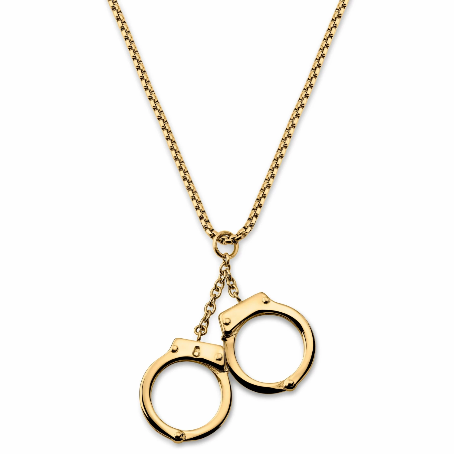 This gold-tone men’s necklace is made of scratch- and tarnish-resistant surgical-grade stainless steel PVD coated gold tone. The curved box links provide superior comfort, and the chain’s adjustable length puts you in charge of where the handcuffs fall. Closes securely with a lobster-claw clasp.