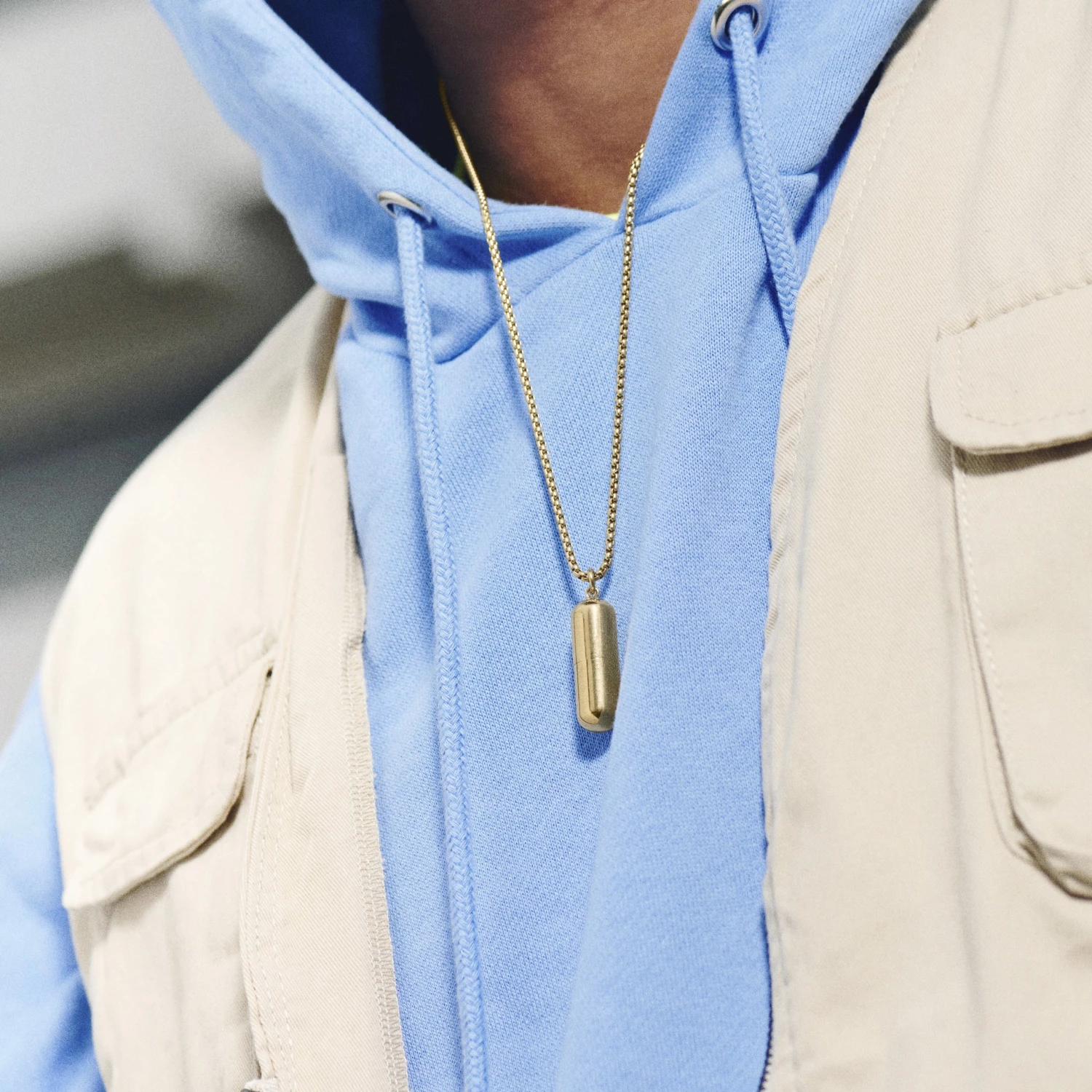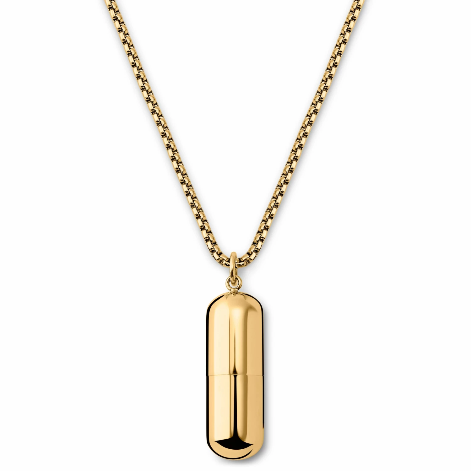 Carry your contact info on a tiny rolled-up piece of paper and give your info to attractive strangers in a memorable way with this gold-tone pill-shaped container necklace for men.