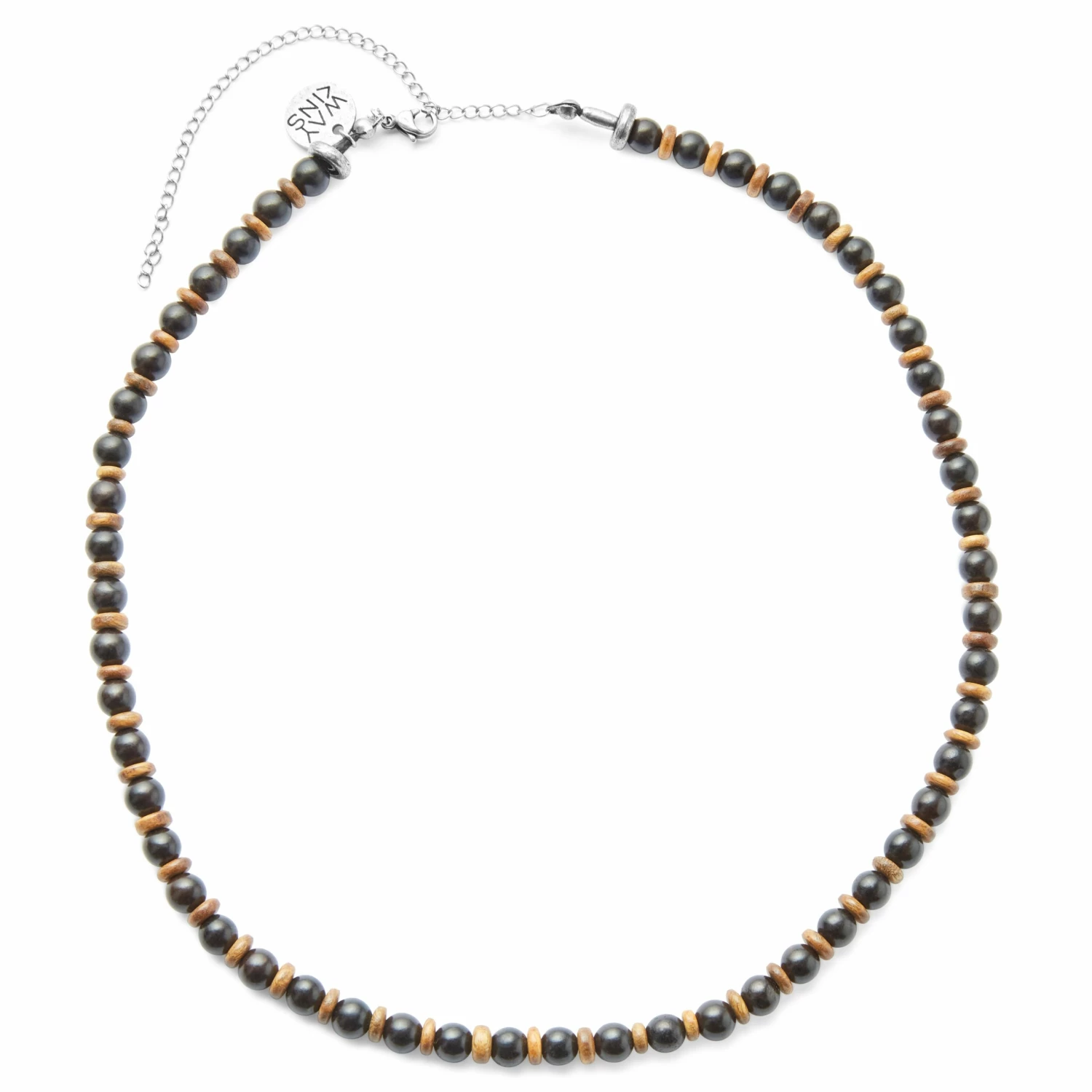 A silver-toned Waykins charm sits at the top of the necklace and in contrast to the polished wooden beads. Complete with a gift pouch.